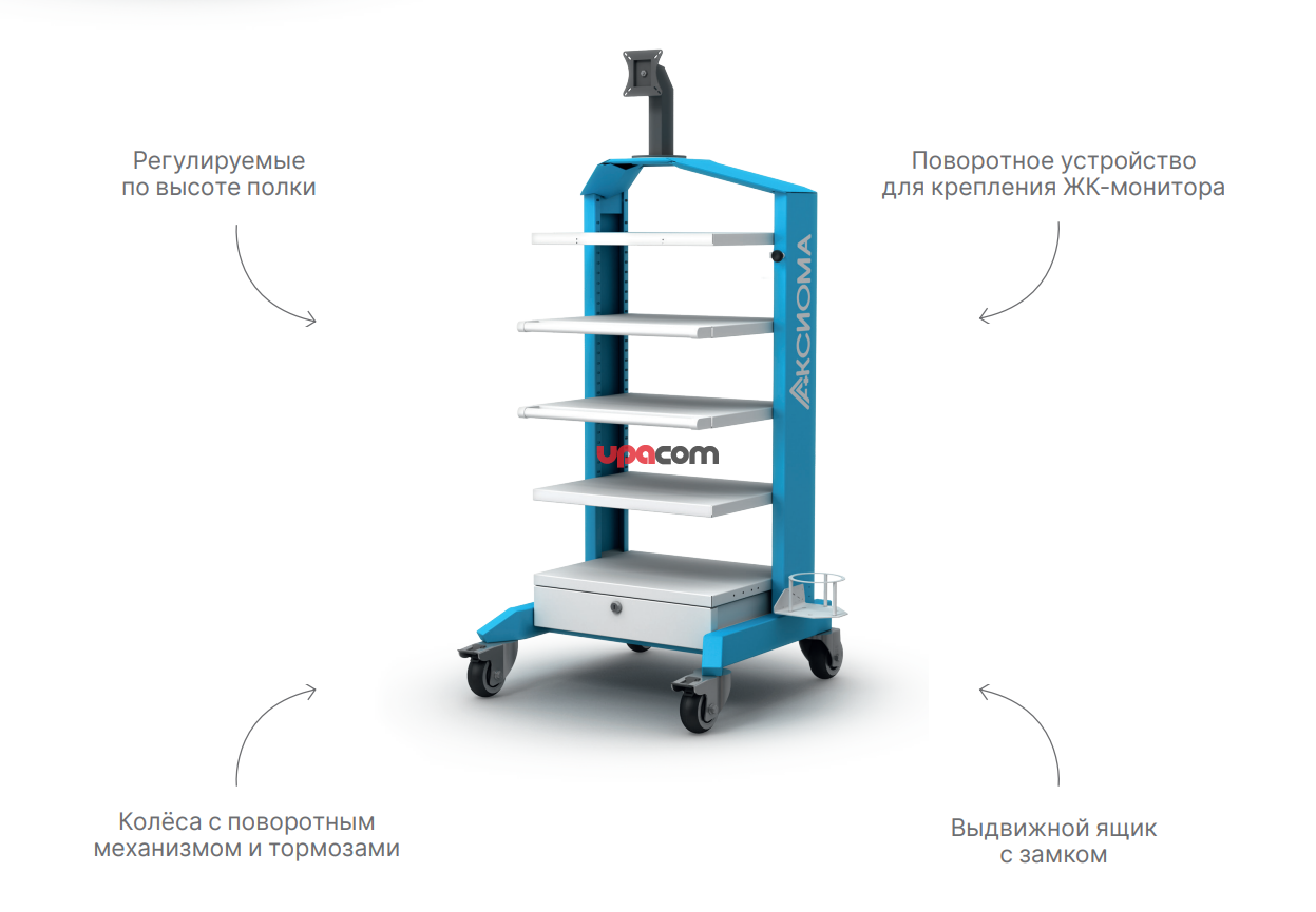 Стойка СПЛ-03 «АКСИ» тип 3 лапароскопическая— это специализированное оборудование для организации и размещения компонентов лапароскопической системы: видеокамеры, осветителя, монитора, инсуффлятора, электрохирургического аппарата и другого инструментария.