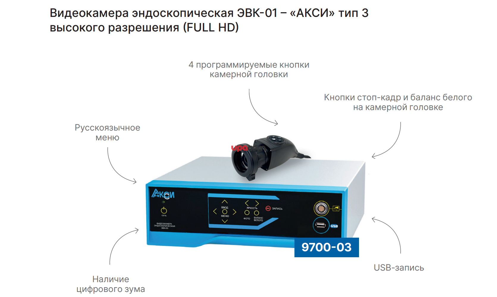 Эндоскопическая видеокамера высокого разрешения ЭВК-01-«АКСИ» тип 3 предназначена для трансляции на медицинский монитор высококачественного цветного изображения операционного поля, получаемого через жёсткие эндоскопы с помощью, входящей в комплект камерной головки.